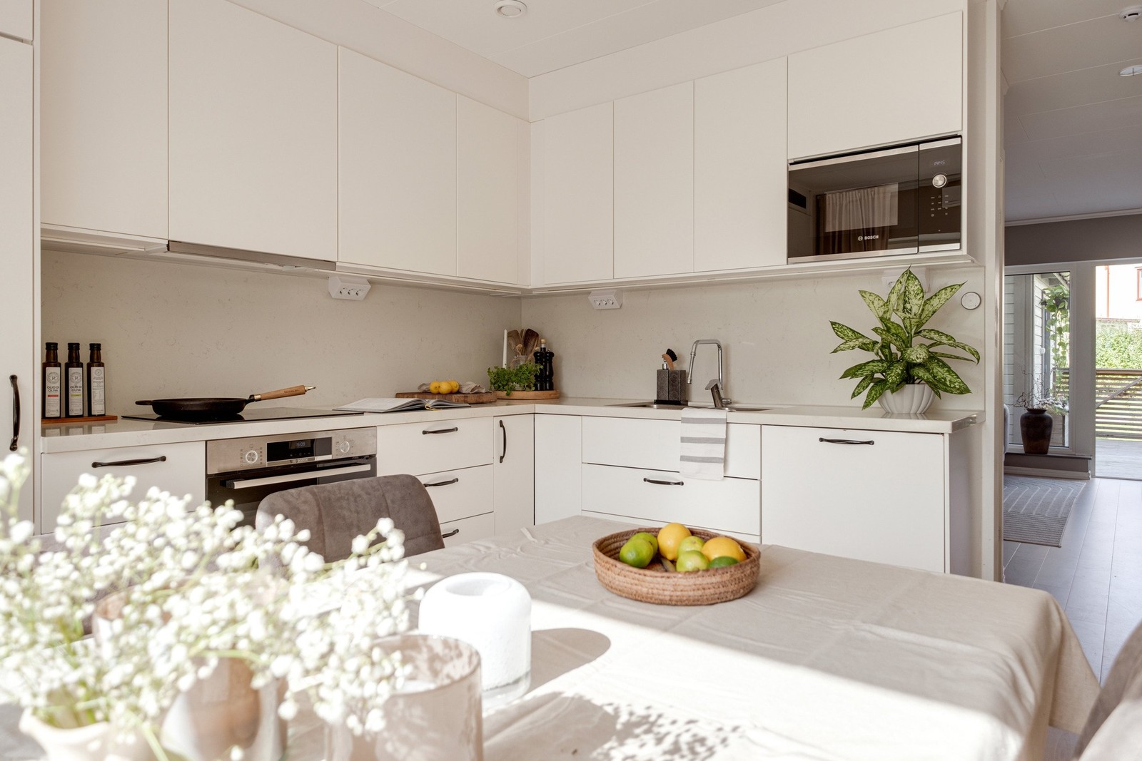 På bottenvåningen möts du av en rymlig och ljus planlösning med delvis öppet kök och vardagsrum, perfekt för sociala sammanhang och familjeliv. Köket är fullt utrustat med moderna vitvaror och eleganta ytor, vilket gör matlagningen till ett rent nöje. Intill fönstret finns plats för ett stort matbord.