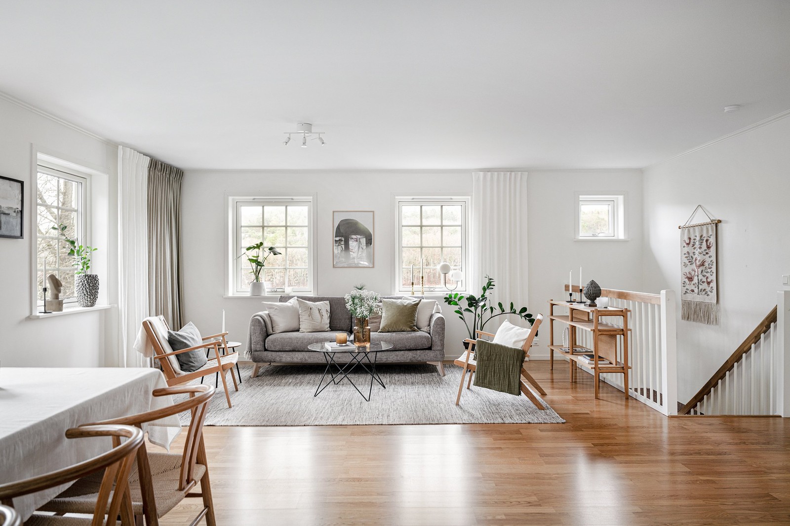 Interiören är smakfullt inredd med fina parkettgolv och ljusa ytskikt som skapar en modern och luftig känsla. Badrummen är helkaklade med kakel och klinker i tidlösa färgval. Uppvärmning och ventilation sker via energieffektiv frånluftsvärmepump, fördelat med skön golvvärme i hela huset för optimal komfort året runt.