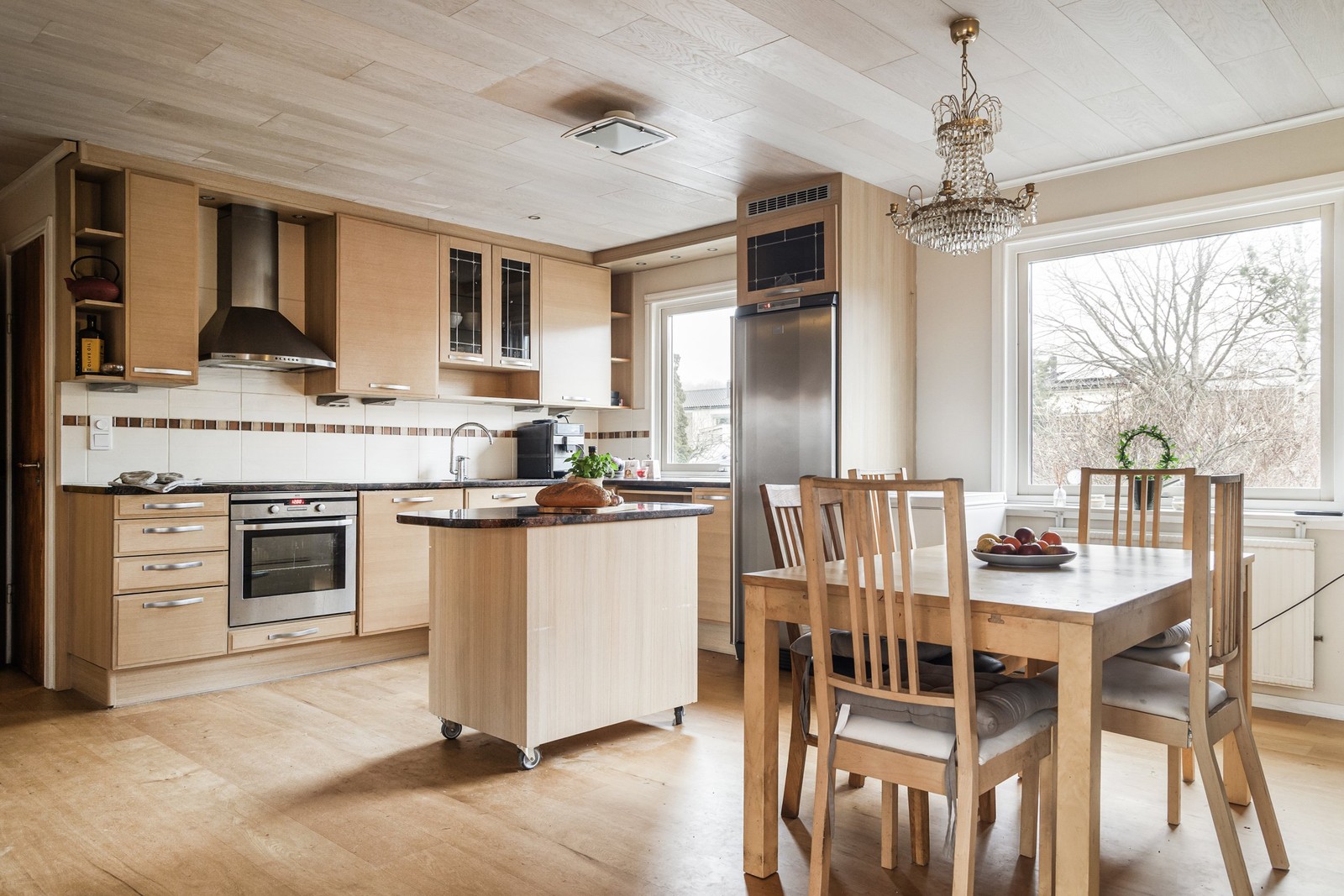 Köket är renoverat och erbjuder goda arbetsytor samt plats för matbord. På entréplanet finns även två rymliga sovrum, badrum samt gästtoalett – en praktisk och funktionell planlösning för vardagens behov.