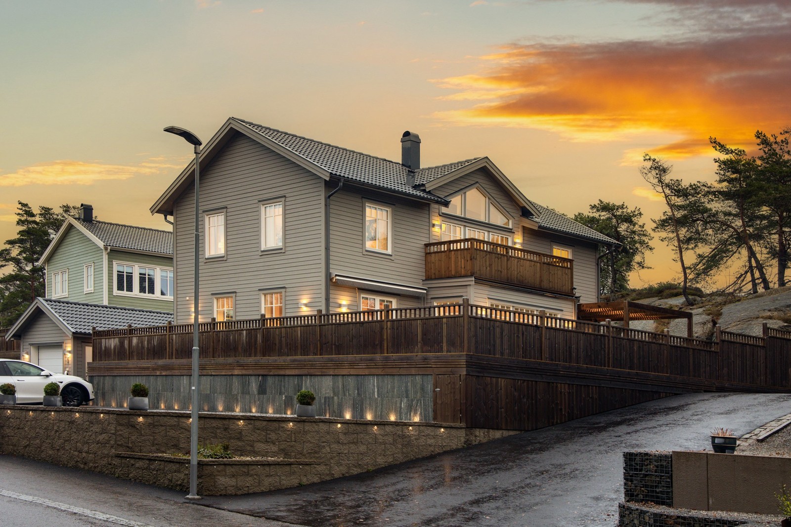 Det enorma altandäcket bjuder in till samvaro med plats för flera stora sittgrupper under bar himmel. En del av altanen är under en skuggande pergola vilket kan vara skönt när solstrålarna blir för påträngande, här ges nämligen ett fantastiskt solläge. Plats finns för den som vill komplettera med exempelvis platsbyggt utekök, uterum eller spabad. Den behändiga och plana gräsmattan kantad av det vackra berget ger en privat och skyddad trädgård för lek och spel eller att utveckla vidare med ytterligare rabatter och planteringar. För att fånga de sista kvällsstrålarna är den stora balkongterrassen en härlig plats där man samtidigt kan njuta vyer som visar på fästningen eller havet som skymtas mot horisonten. Garage, fristående friggebod/förråd och bra med uppställningsplatser för bil och båt, elbilsladdare och bra förutsättningar till låga driftkostnader är andra kvaliteér som detta hem erbjuder.