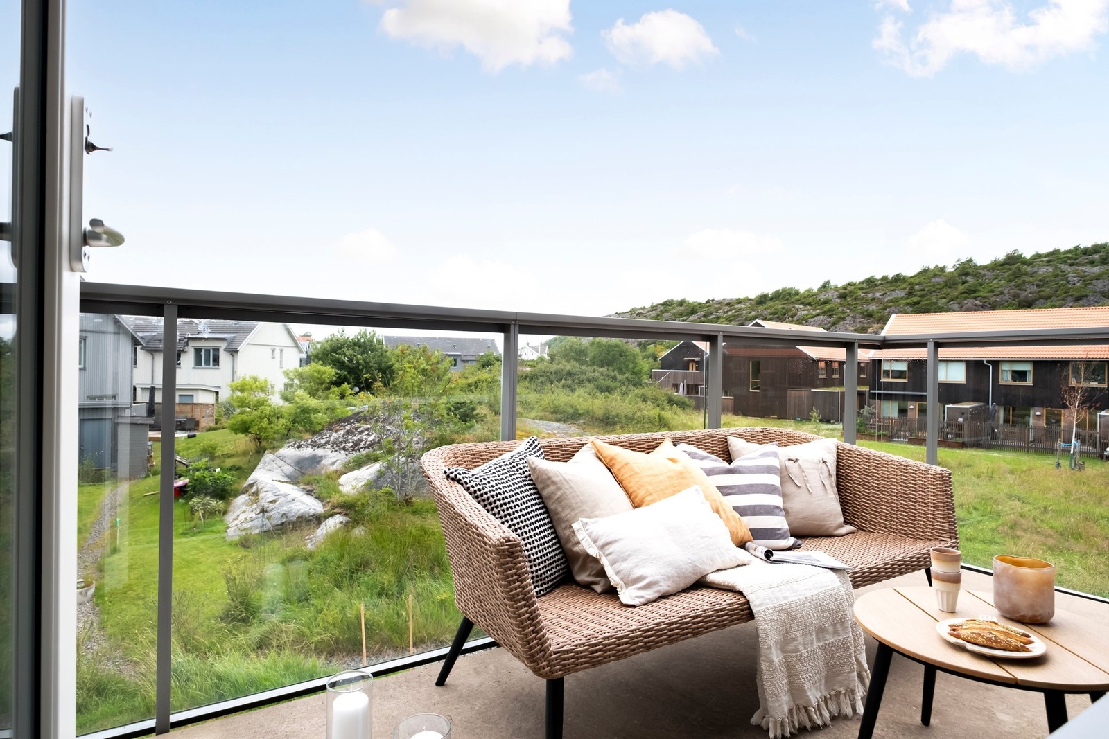 Två härliga balkonger i olika väderstreck gör att du kan njuta av både morgonkaffet i solen och ljumma sommarkvällar med utsikt – helt utan insyn. Oavsett årstid bjuder balkongerna på fri utsikt över omgivningarna, vilket skapar en känsla av lugn och rymd.