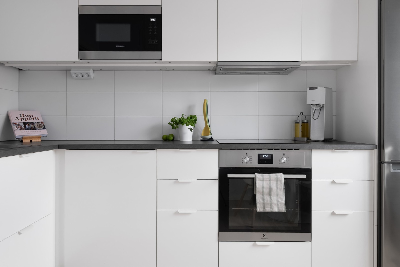 Det nyrenoverade köket är en verklig höjdpunkt. Här möts du av moderna och stilrena ytor, med ljusa skåpluckor och en smart layout som gör det både funktionellt och estetiskt tilltalande. Bänkskivorna är i en hållbar och vacker material som harmoniserar med de övriga ytorna, och vitvarorna håller hög standard, vilket gör matlagningen både enkel och trevlig.