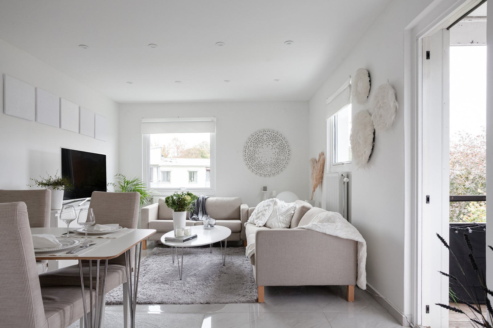 Väl tilltaget vardagsrum som ger plats för sociala umgängen. Här finns gott om plats för både den större soffgruppen och matsalsmöbel. I anslutning till vardagsrummet nås utgången till bostadens balkong som bjuder på en fridfull utsikt mot den välskötta trädgården. På balkongen kan du njuta av lugnet och stillheten medan du avnjuter en kopp kaffe eller annan dryck.