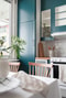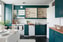 Blått kök med gott om arbetsyta och bra förvaring i skåp och lådor. Luckorna finns för komplettering om så önskas. Given plats för matbord intill fönster. Köket är praktiskt utrustat med diskmaskin, kombinerad spis och ugn, fläkt samt kombinerad kyl och frys.