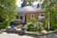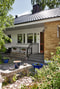Uteplats intill entrédörr samt uteplats som nås från vardagsrummet mot trädgården.