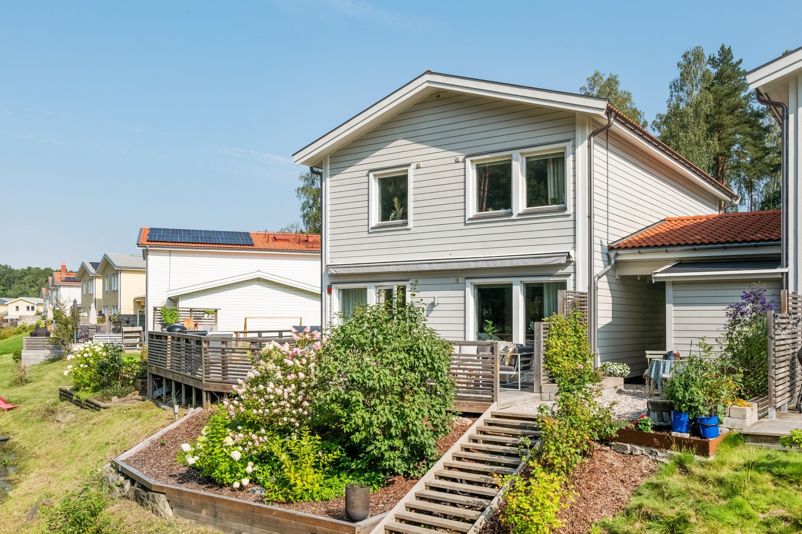 Den lättskötta trädgårdstomten rymmer både uteplatser och odlingsmöjligheter. På den väl tilltagna altanen finns ett utekök som flitigt nyttjas av de boende. Här ryms även den större matgruppen för tillfällen när familjen har besök av vänner eller familj. Altanen nås direkt från vardagsrummet som en naturlig förlängning av bostadens sociala ytor.