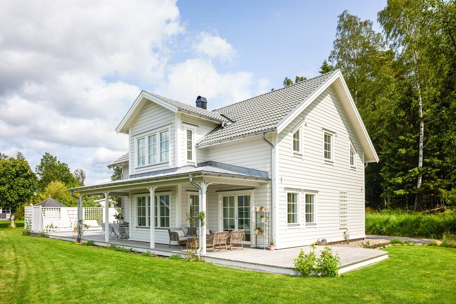Välkommen att uppleva den tidlösa charmen hos ett klassiskt New England-hus i skandinavisk stil. Den amerikanska verandan som löper utmed hela fasaden är både otroligt praktisk och mycket vacker. Det generöst tilltagna pooldäcket inramas på ett trevligt sätt av ett fint staket och här ute spenderas gärna många timmar i avkopplande miljö efter arbete och skola.