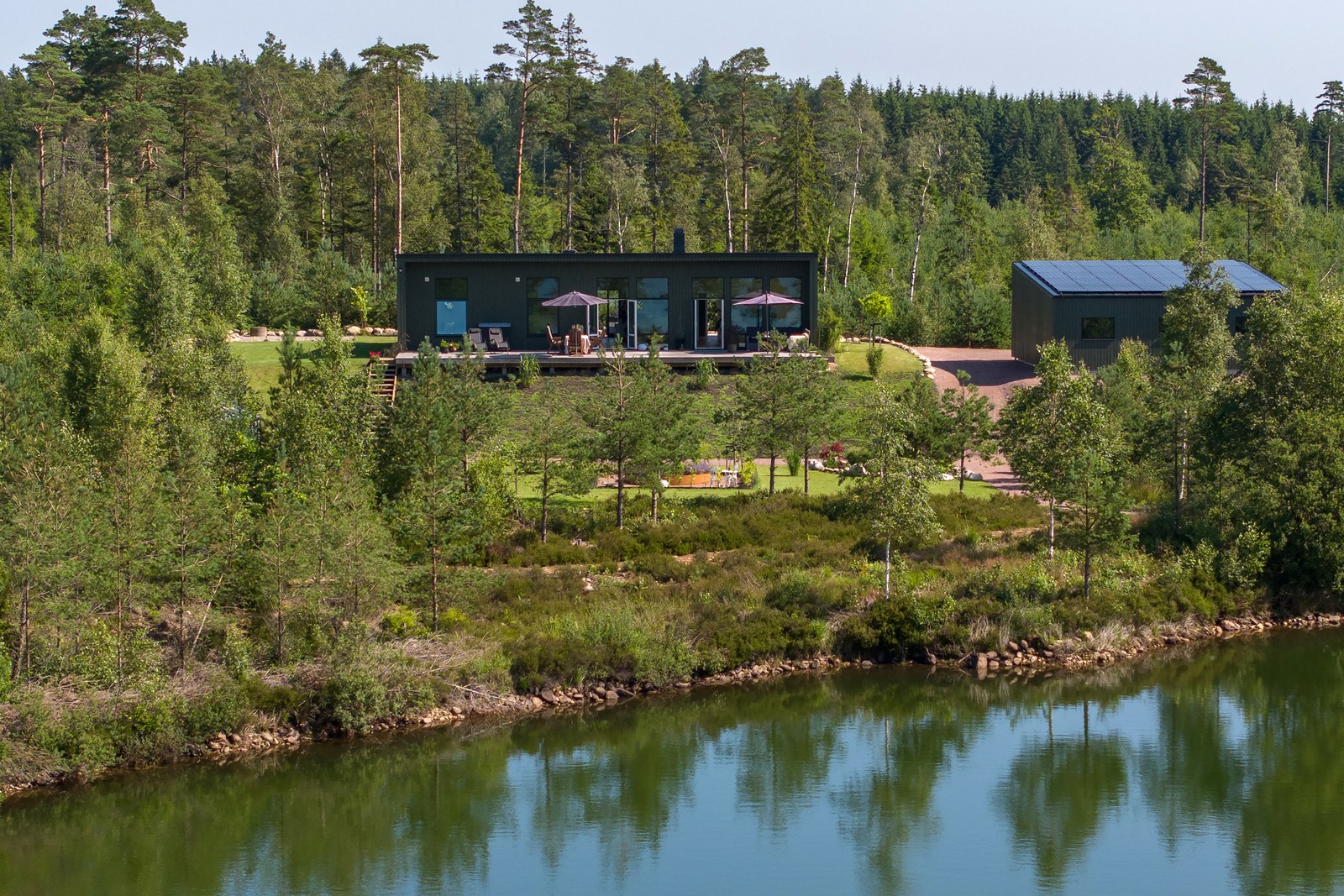 Arkitektritat enplanshus beläget vid sjö i lummig omgivning