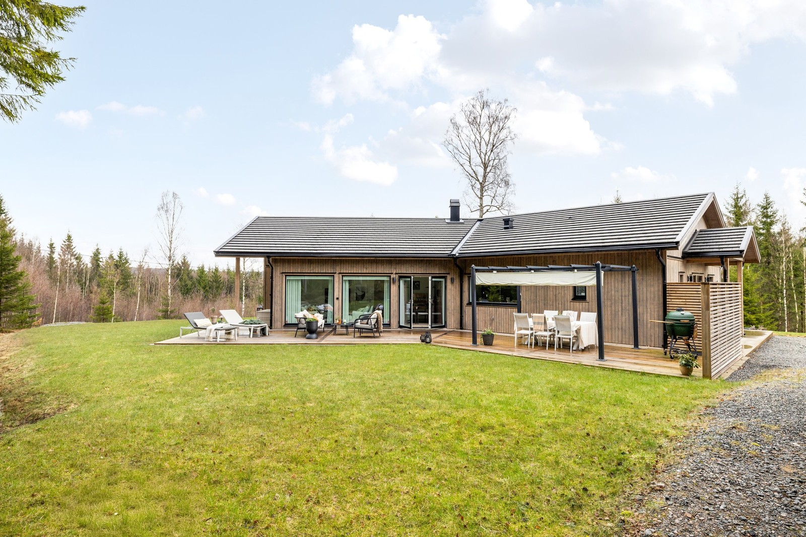 Stor, inbjudande altan som löper längs två sidor av huset och skapar flera naturliga zoner för matplats, loungedel och grill – perfekt för både avkoppling och stora sällskap.
