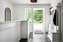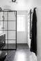 Duschrummet är helkaklat med ett mörkt marmorgolv, elektrisk golvvärme och vita kaklade väggar. Här finns duschplats, wc, mörk kommod, spegelskåp med belysning och elektrisk handdukstork.