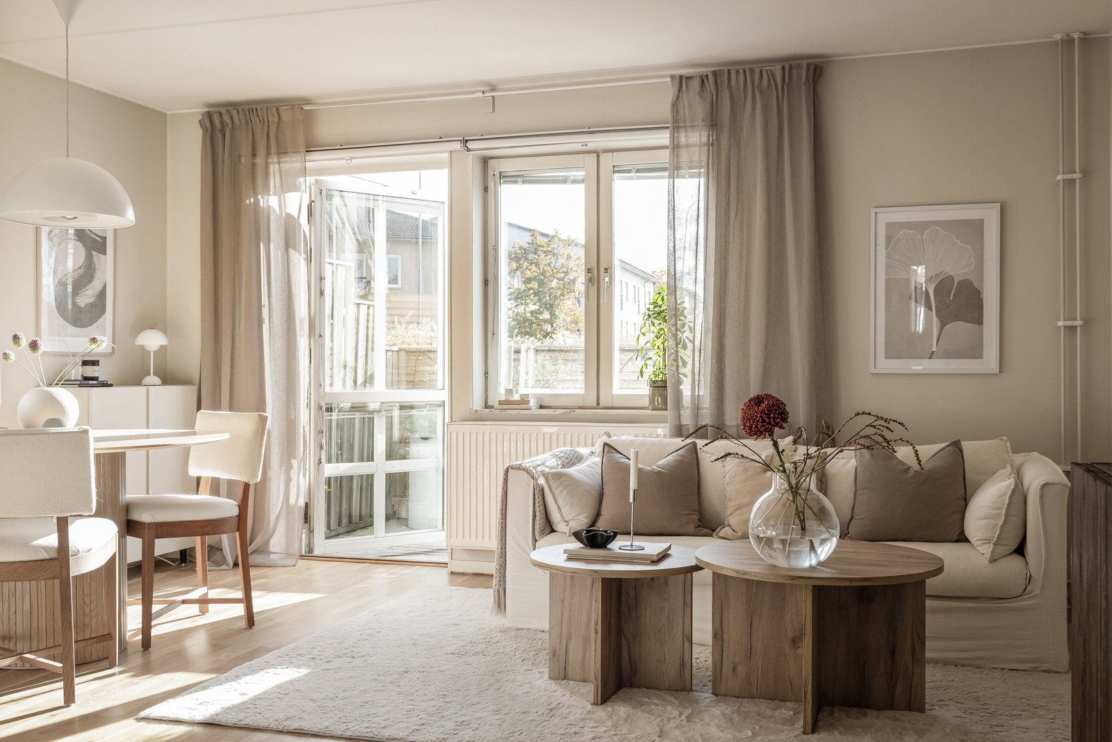 Lägenheten erbjuder en smart planlösning med modern interiör och ljusa materialval som skapar en härlig luftig känsla. Vardagsrummet har plats för både soffa och matbord, och sovdel. Köket är fräscht och funktionellt, utrustat med moderna vitvaror som gör matlagningen till ett nöje. Här finns också ett rymligt badrum med och gott om förvaringsmöjligheter. Bostadens härliga uteplats i söderläge blir en favoritplats under sommarhalvåret.