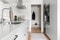 Smakfullt kök i elegant grå ton med tidlös bänkskiva i sten. Köket renoverades 2017 och är utrustat med micro, ugn, häll, kombinerad kyl/frys samt integrerad diskmaskin från samma år. Här finns gott om förvaring och arbetsyta, och ett matbord för fyra personer ryms utan problem – perfekt för både vardag och umgänge.
