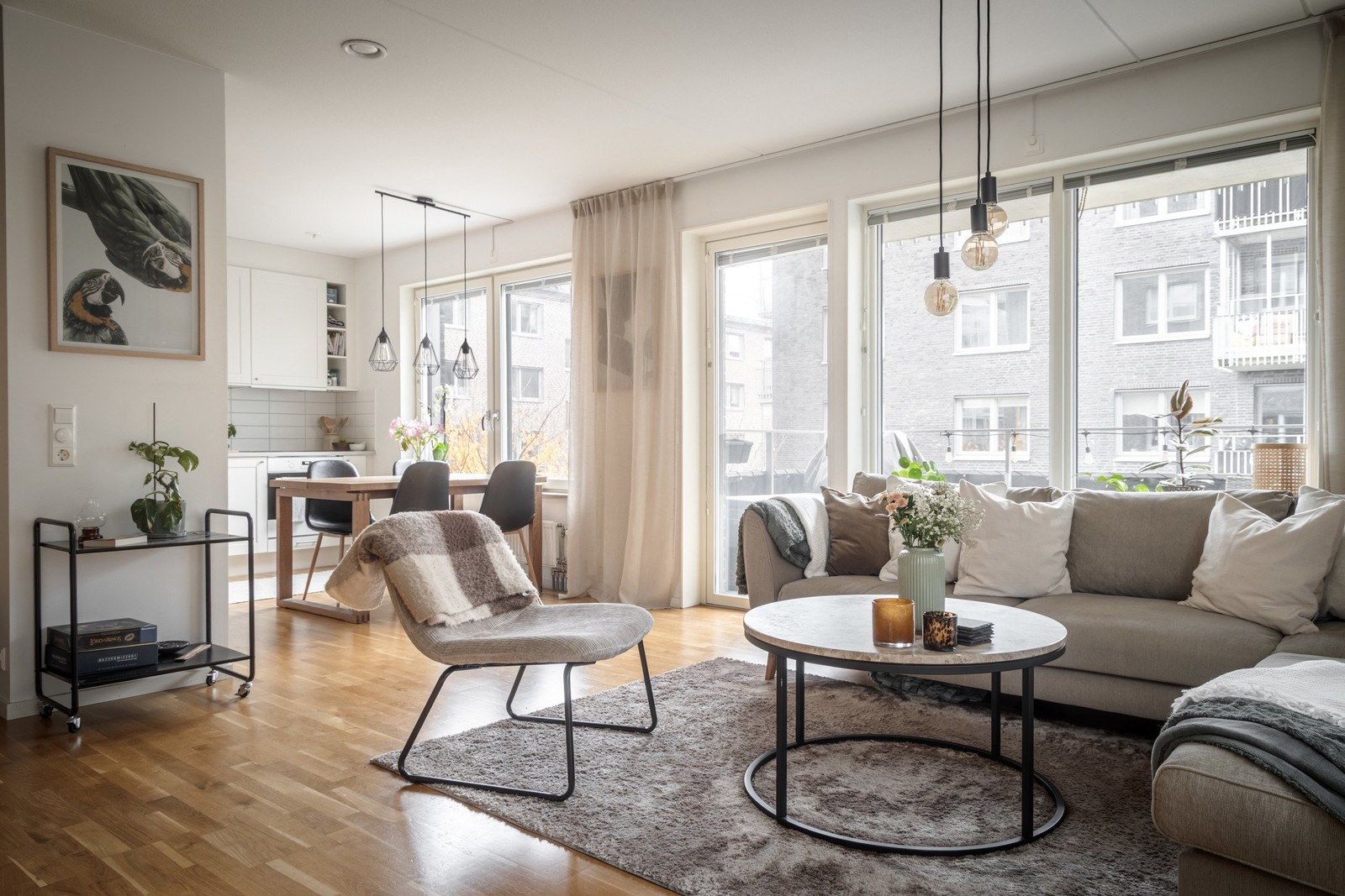 Lägenhetens välplanerade ytor håller genomgående hög standard med moderna materialval. Stora fönsterpartier ger ett härligt ljusflöde över det parkettgolvet och den delvis öppna planlösningen mellan vardagsrum och kök i modern stil. Vidare finns ett rymligt sovrum, helkaklat badrum med kombinerad tvättmaskin/torktumlare samt gott om plats för både vardag och umgänge. Här bor man med alla tänkbara bekvämligheter – det är bara att flytta in.
