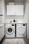 Den inbjudande hallen erbjuder gott om förvaring i form av garderob och hatthylla. Härifrån når du en gäst-wc och direkt intill ligger det stilrena badrummet med dusch, toalett, handfat samt både tvättmaskin och torktumlare – en praktisk lösning för en smidig vardag.