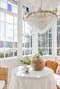 Dubbla pardörrar bjuder in till nästa ljusa salonger i fil. Villans matsal för tankarna till en festsal med två kakelugnar, detaljskurna listverk och de stora, vackert renoverade fönster med bibehållna originalglas. Några levande ljus räcker för att skapa en närmast historisk atmosfär runt långbordet. En höstkväll kan brasorna kan spraka i de vackra kakelugnarna med blankpolerade mässingsluckor. En sådan kväll är det lätt att föreställa sig det tidiga 1900-talets högtidliga middagar runt det stora matbordet med frasande sidenklänningar och de frackklädda herrarnas bolmande cigarrer.