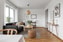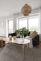 Den öppna planlösningen mellan kök och vardagsrum skapar en luftig och inbjudande atmosfär, idealisk för att umgås med familj och vänner. Det stilrena, vita köket har ett fönster ovanför diskhon som släpper in härligt ljus, här finns gott om förvaringsutrymme i både skåp och lådor.