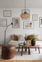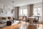 Till vänster finner du vardagsrummet vilket är ljust och rymligt med generöst ljusinsläpp. Väggarna är ljusa förutom en vägg, som är prydd med sten i mörkgrå färg. Denna harmoniserar med de vackra fönsterbrädorna som också är i sten. I rummet ryms gott om plats för soffgrupp och annat möblemang.