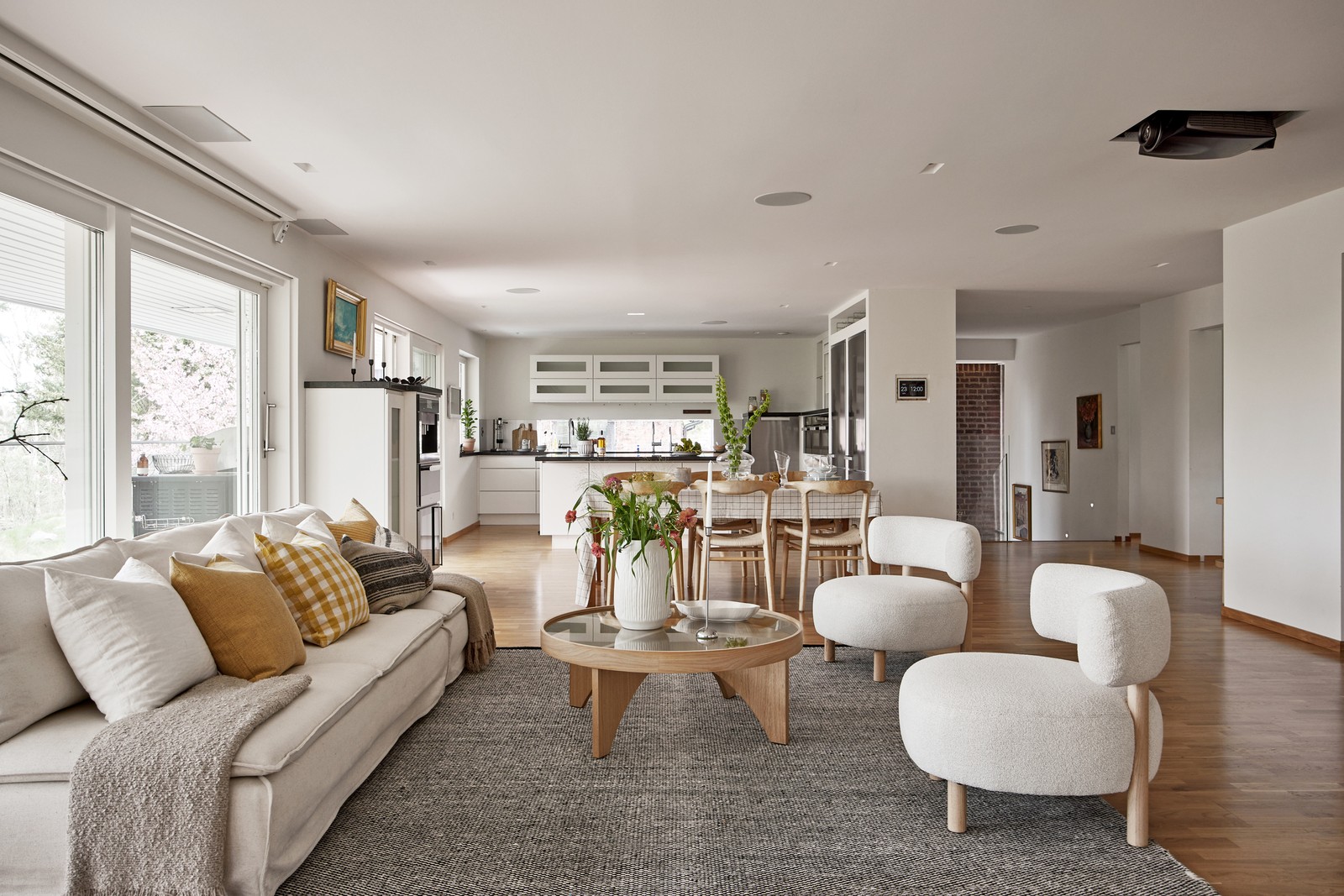 Väggen till vardagsrummet har tagits bort och givit en social och luftig planlösning. Det större matsalsbordet får fint plats intill köksön innan soffgruppen tar vid. Även på denna våning sitter de majestätiska Hajom-partierna och ger ljusinsläpp från golv till tak.