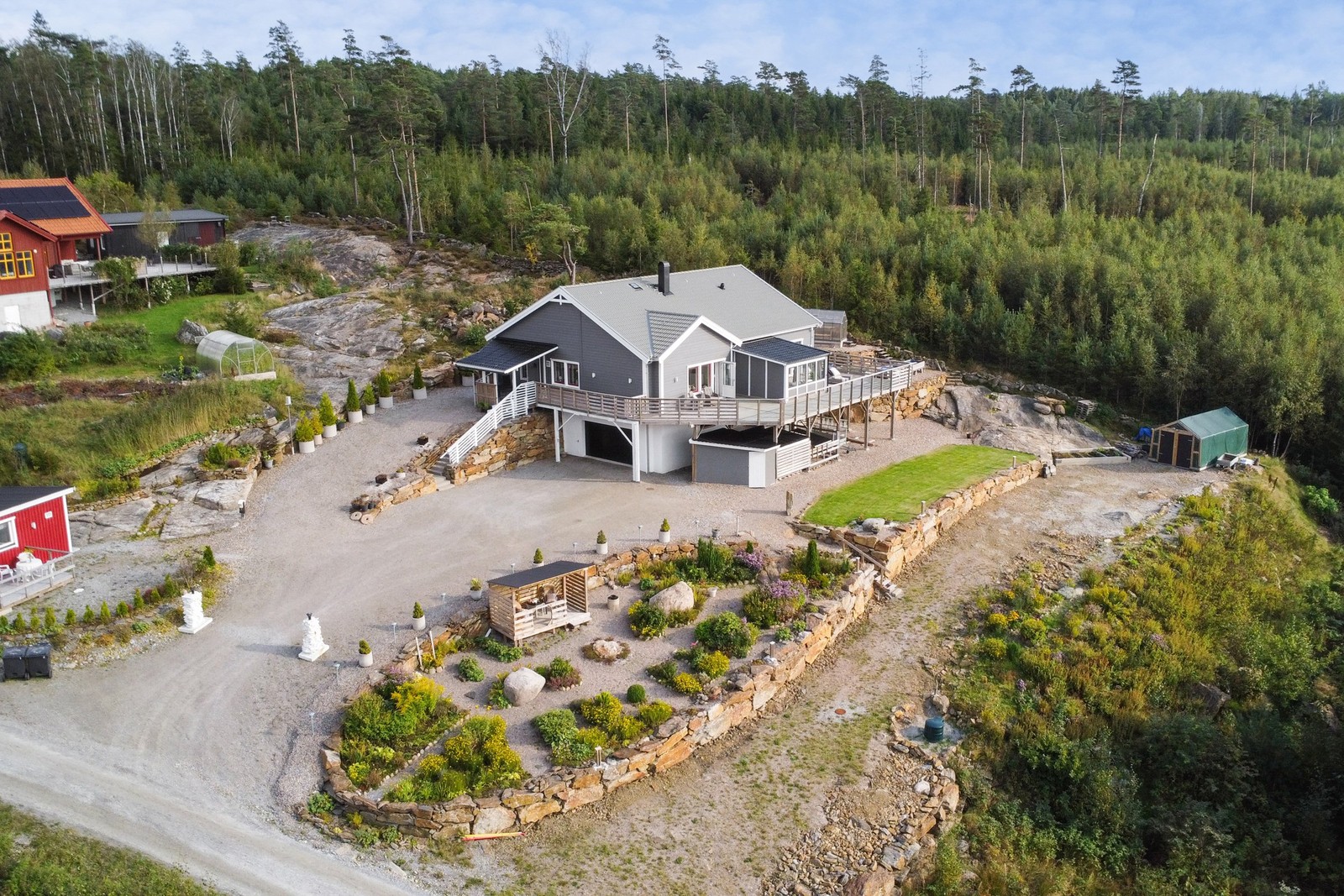 Den här generöst stora villan bär på en sällsynt kombination: generösa ytor för familjeliv och gemenskap, men också plats för stillhet, avskildhet och eget utrymme. Från sin upphöjda position blickar huset ut över grönskande skogsdalar och glittrande vatten, där solen vandrar från morgon till kväll och avslutar dagen med en gyllene final i horisonten. Det står pampigt och stabilt här på höjden och du har första parkett för att skåda årstiderna, väder och himmlespel med också när båtar och fartyg går förbi - det är som att vara på kryssning året om. Någon insyn har du inte heller, utan kan njuta av lyxen med att bo privat, högt och stillsamt.