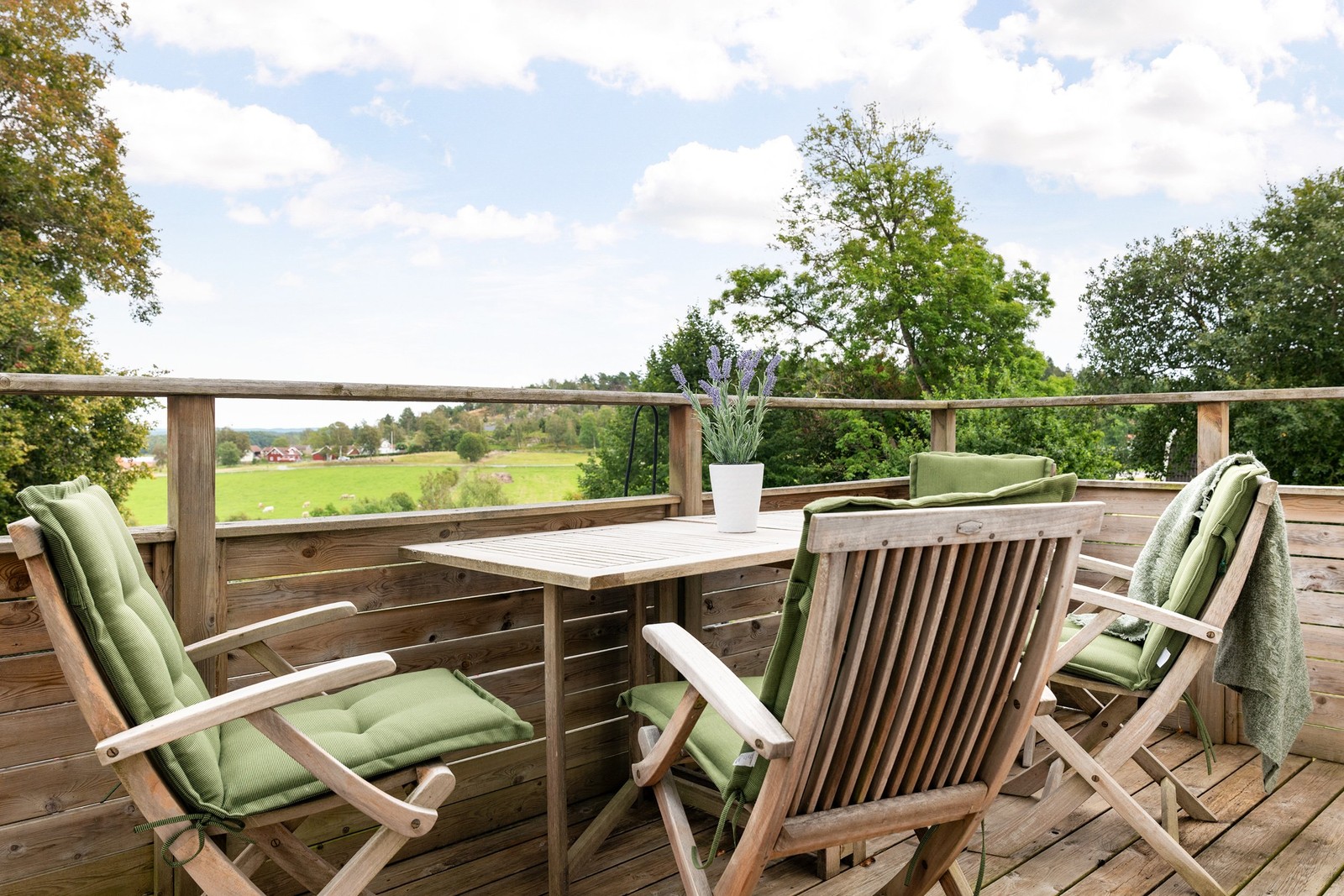 Två fina uteplatser, en i markplan vid entrésida och läge sydväst och en rymlig balkong med utsikt över ängar och vacker natur i läge nordväst.
