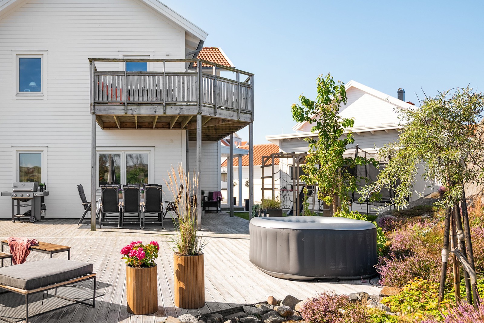Smakfullt, rymligt hus med trevliga uteplatser och stort garage. Vacker utsikt över takåsar och hav.