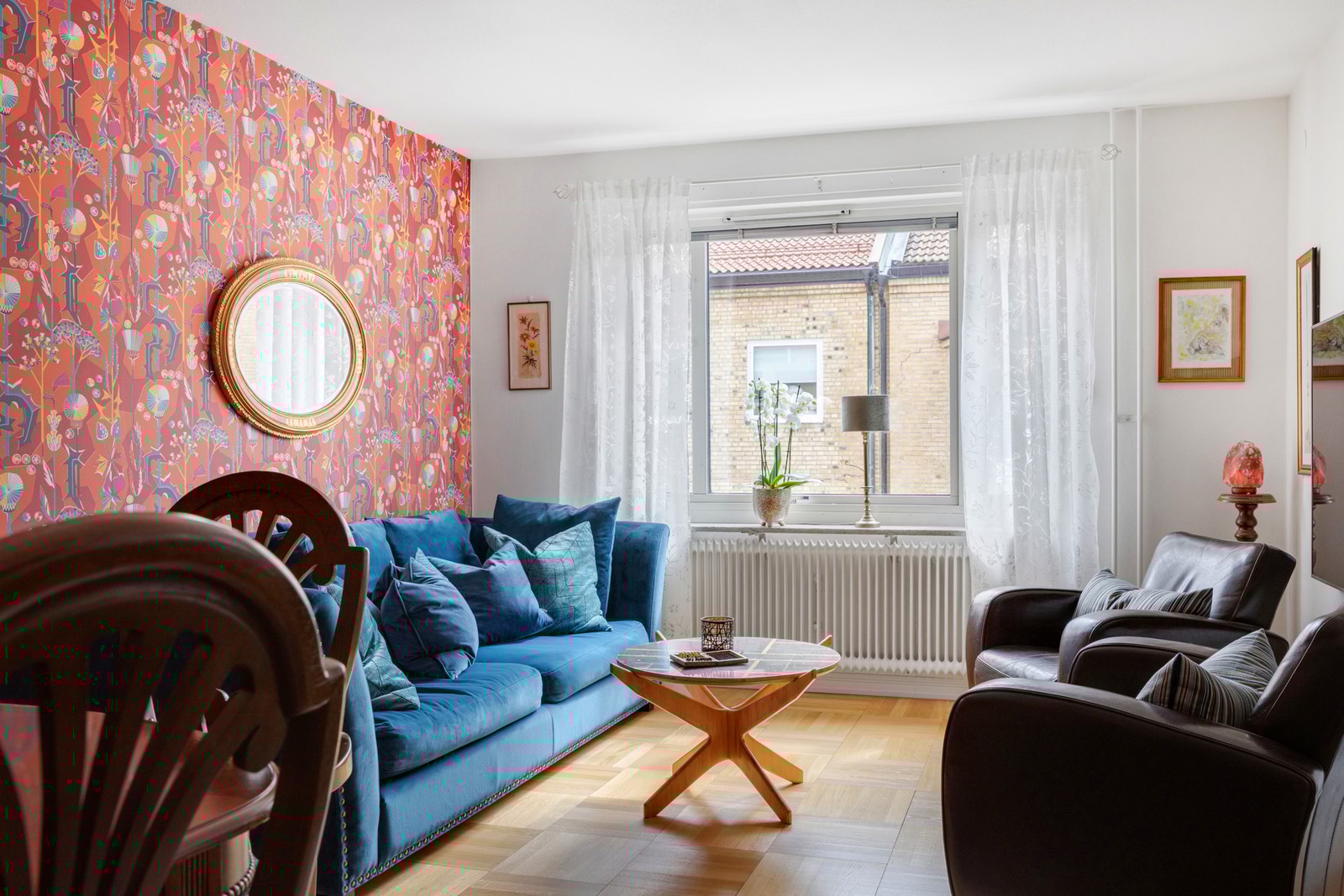 Rymligt vardagsrum med härligt ljusinsläpp. Parkettgolv och gott om plats för möblering till både soffa och matplats med nästan 25 kvm tillgodo.
