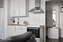 Det stilrena köket går i ljusa toner med gott om förvaring bakom släta skåpsluckor samt bra arbetsytor. Här finns full maskinell utrustning och en modern spis med fläkt som smälter väl in i helheten. Rummet lättmöblerat med plats för både soffa, matbord och sänglösning. Rummet erbjuder smart förvaring i en skjutdörrsgarderob.