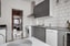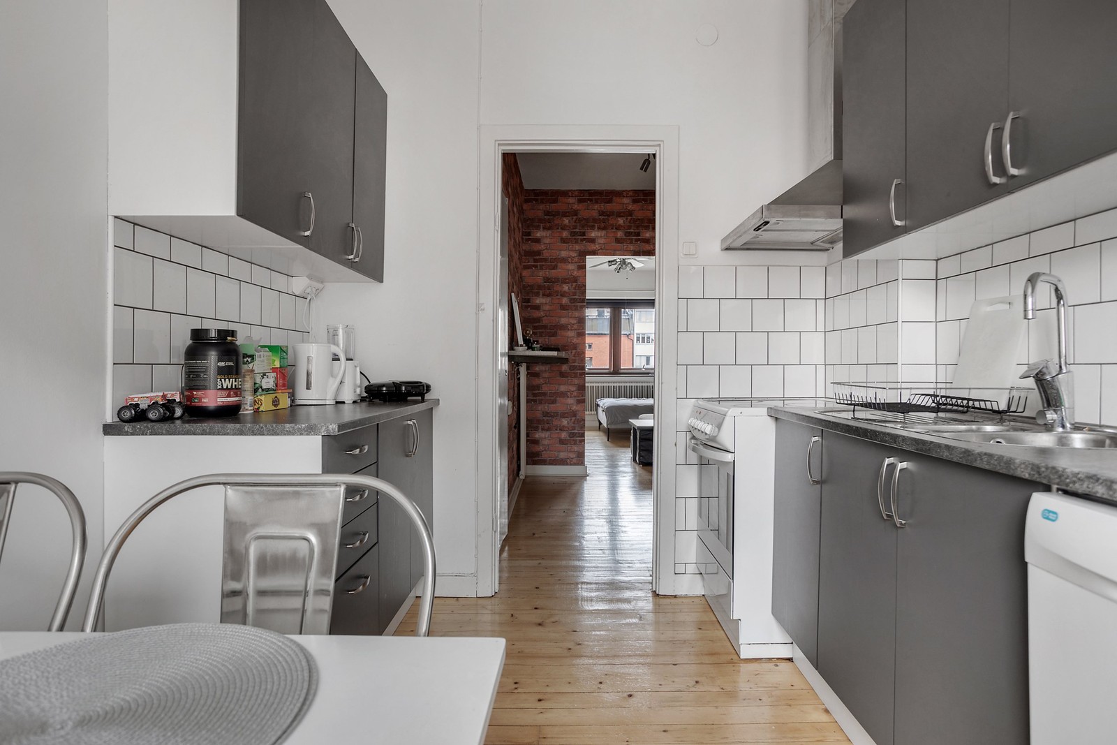 Uppdaterat kök med modernt touch på luckor i en snygg, grå nyans, kakel om 15*15cm, bänkskiva i laminat samt bra förvaring & bänkyta. Den maskinella utrustningen består av spis, spisfläkt, diskmaskin, inbyggd mirko, vinkyl samt kyl/frys. Plats för matbord.