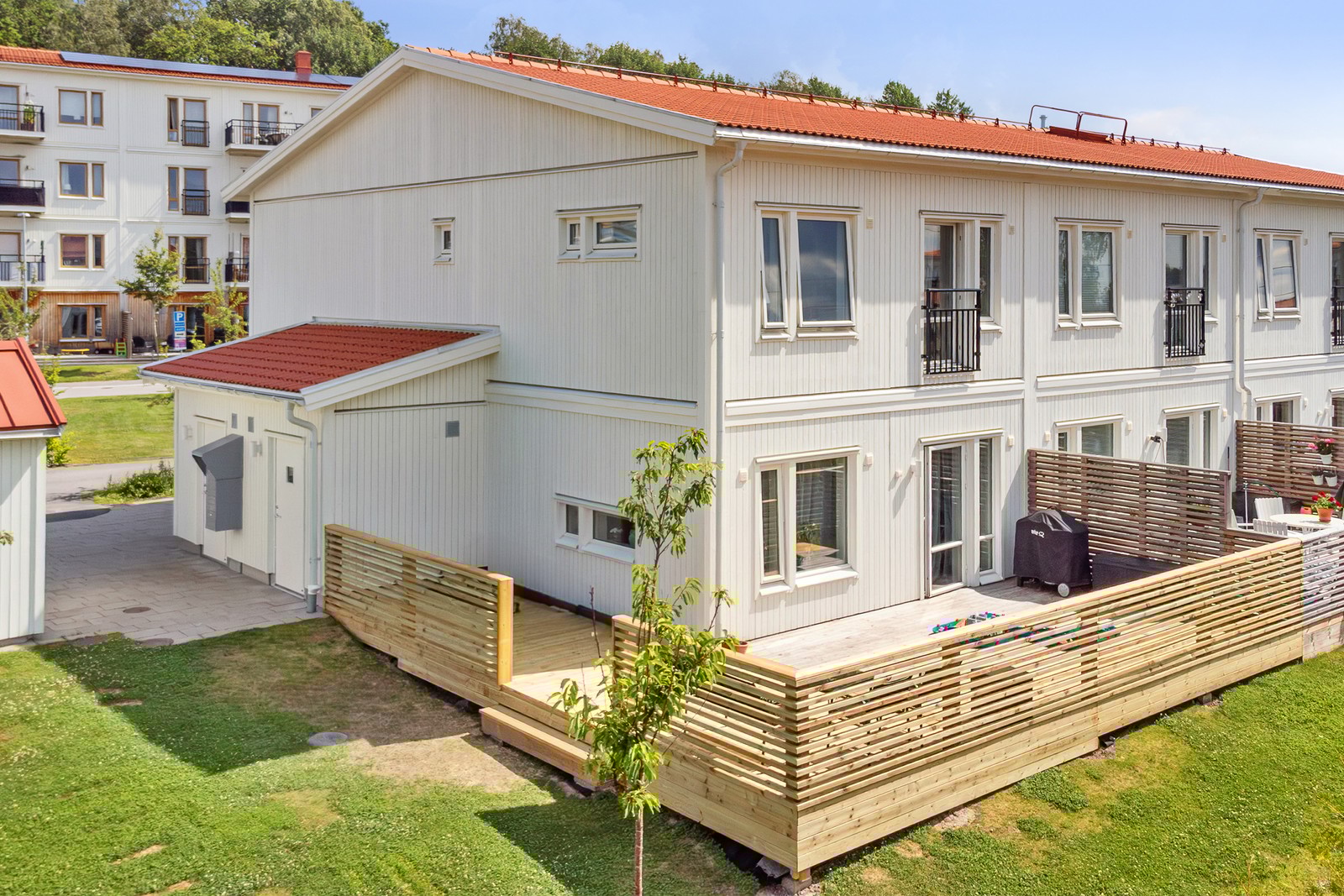 Större altan med trall på baksidan huset som nyligen har byggts ut och ger gott om utrymme för utemöbler och grill. Eftermiddags-, och kvällssol med ett insynsskyddat läge.