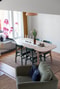 Rymligt och socialt vardagsrum med gott om plats för såväl soffgrupp som matplats. Här ges ett härligt ljusinsläpp från altandörren och flertalet stora fönster med en grönskande utsikt. Här är högt i tak och vita väggar bidrar till en känsla av rymd. Parkettgolvet ger värme åt rummet.