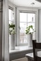 Ljust vardagsrum med burspråk och parkettgolv. Plats för såväl sittgrupp som matplats. Utgång till baksidan via altandörr.