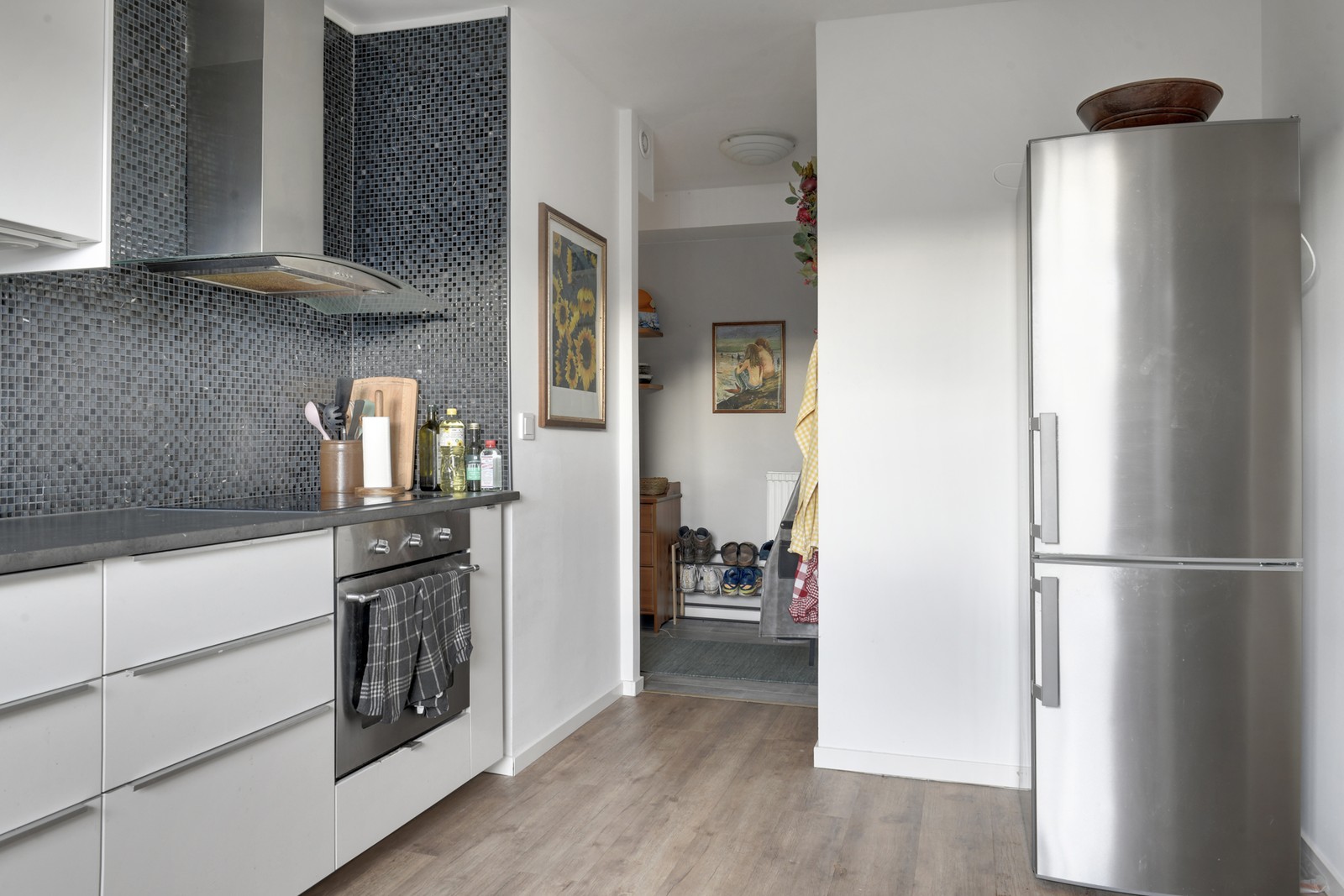 Stilrent kök från IKEA som renoverades 2017. Köket är utrustat med vita och moderna skåpluckor, bänkskiva i laminat och snygg mosaik ovan bänkyta som ger riktig karaktär i köket. Den maskinella utrustningen består av integrerad diskmaskin, inbyggd mikro, induktionshäll och ugn, spisfläkt och kyl/frys. Från köket finns det en öppning mot hall samt bred öppning mot vardagsrum. Här ligger ett mycket snyggt och slitstarkt laminatgolv som ligger genomgående i nästan hela lägenheten för ett enhetligt intryck. Den breda öppningen gör planlösningen mellan kök och vardagsrum social samtidig som den ändå är avkild.