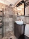 Badrummet som renoverades 2017 är också stilfullt. Här finns wc, handfat med kommod, spegelskåp, dusch med vikbara väggar och handukstork. Notera att det är framdraget och förberett för en tvättmaskin.