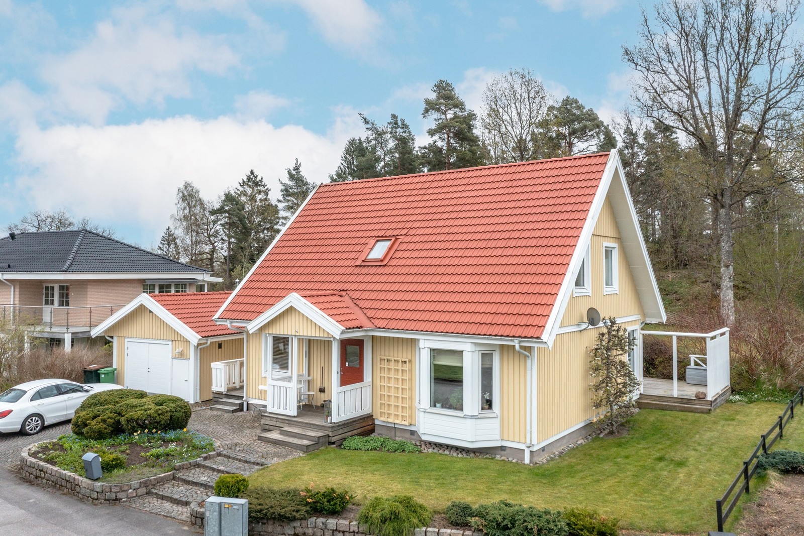 Uteplatsen under tak förlänger utesäsongen och blir snabbt en favoritplats för såväl morgonkaffet som sommarens middagar. På tomten finns också ett praktiskt garage med förråd.