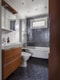 Ett fönster ger naturligt ljusinsläpp och bidrar till en behaglig atmosfär. Sammantaget ett smakfullt badrum med genomtänkta materialval och en tidlös design.