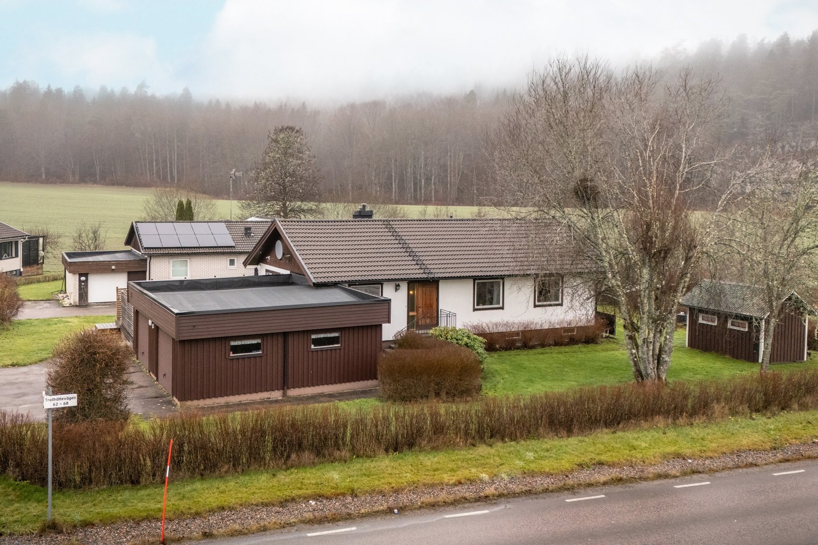 Välplanerat enplanshus med källare, renoverat kök, solig altan och dubbelgarage – i mysiga Sjuntorp