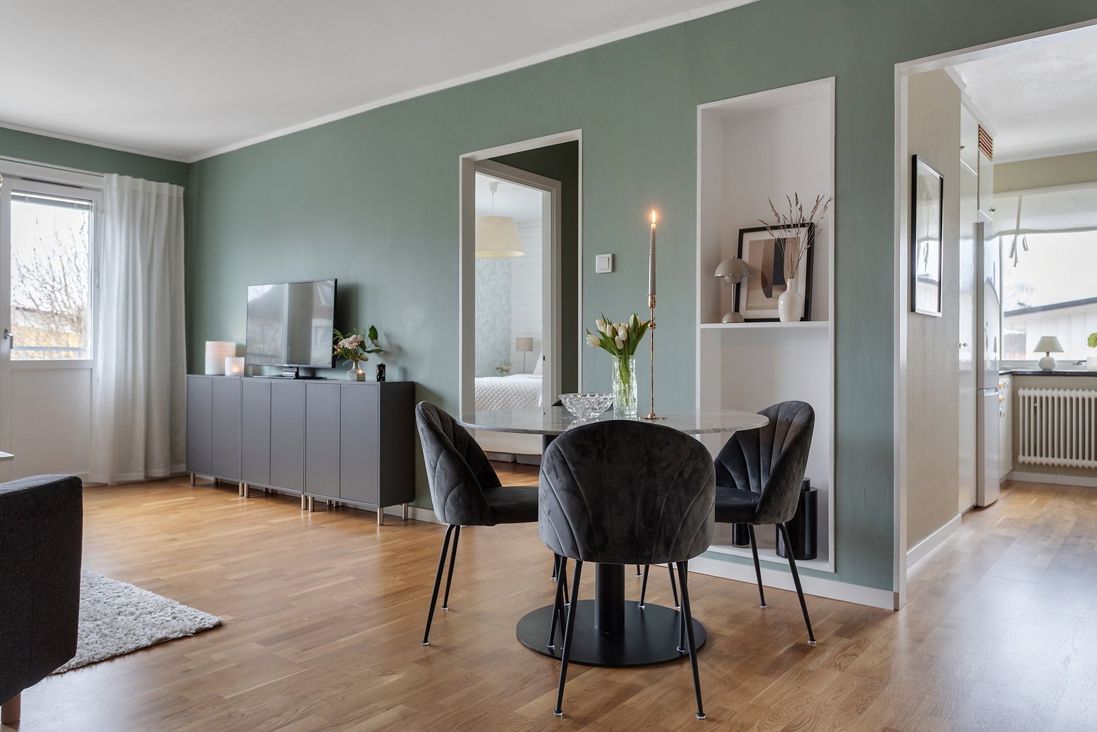 Direkt när du kliver in i lägenheten möts du av ett öppet, ljust och trivsamt intryck! Här ligger ett fint parkettgolv som ligger enhetligt, utan trösklar, i hela lägenheten. I hall/vardagsrum är väggarna målade i en mycket behaglig grön nyans på väggar och gott ljusinsläpp tack vare stort fönsterparti. Här kan du öppna upp via den härliga franska balkongen!