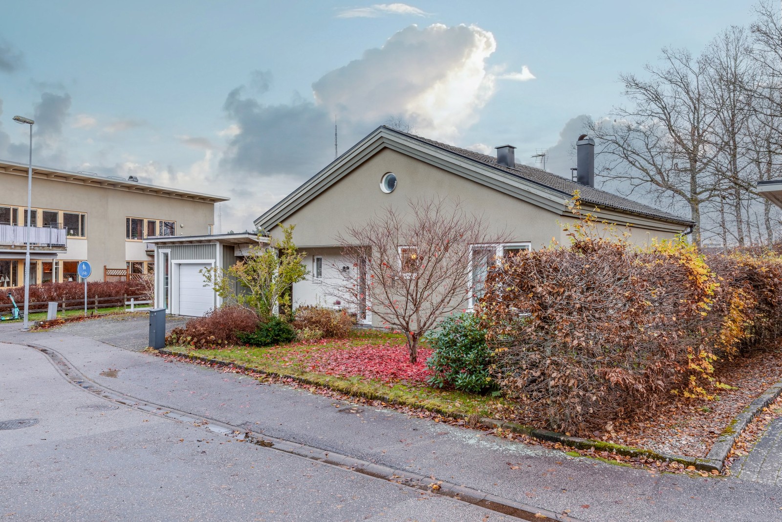 Äntligen erbjuder vi en mycket fin villa med representativ planlösning. Hörntomt med grönskande trädgård, 2 badrum, generös takhöjd, kamin och garage.