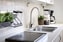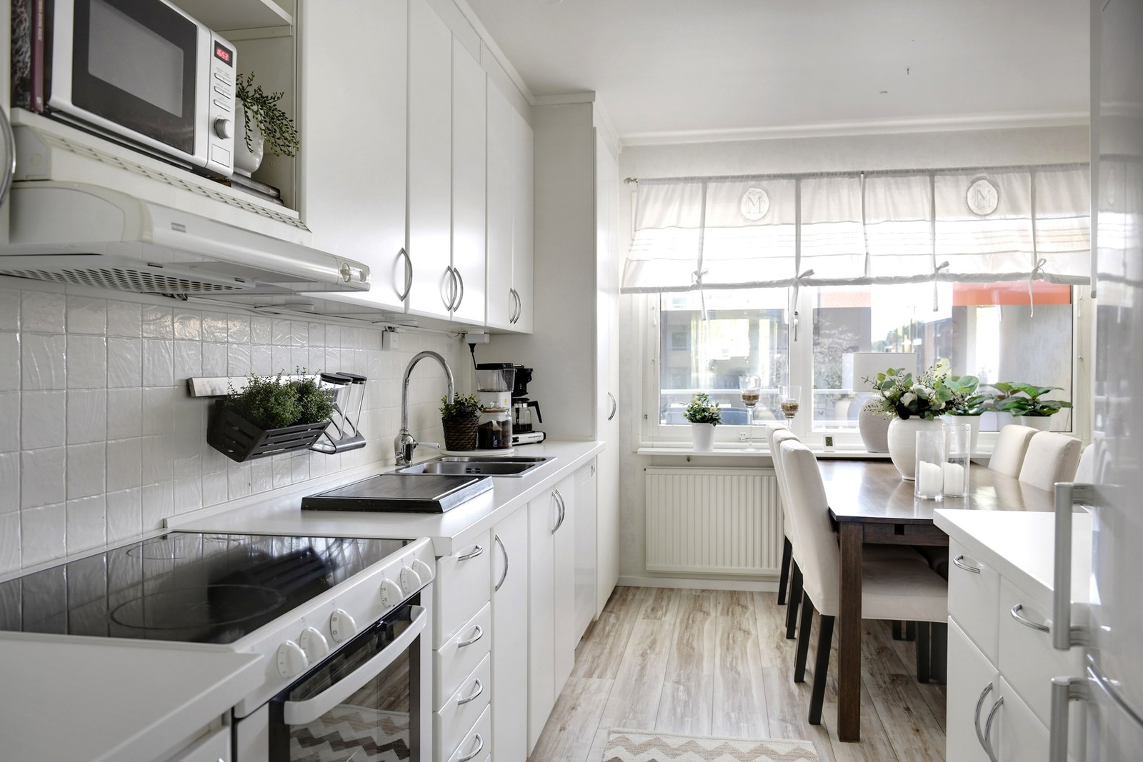 Rymligt kök med gott om förvaringsutrymme bakom de vita klassiska skåpsluckorna. Bra med bänkyta. Maskinellt välutrustat med diskmaskin, spis och ugn, spisfläkt, kyl och frys samt mikro. Naturlig matplats erbjuds intill fönstret. Laminatgolv och vita väggar.