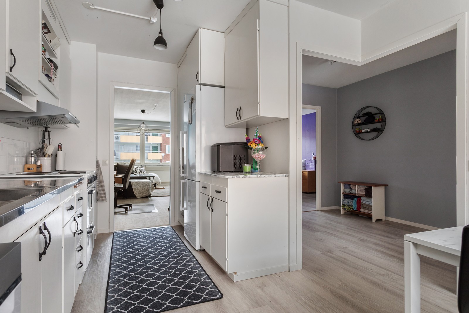 Hall med vinylgolv med avhängningsmöjligheter. Här är det öppen planlösning mot vardagsrum och kök.