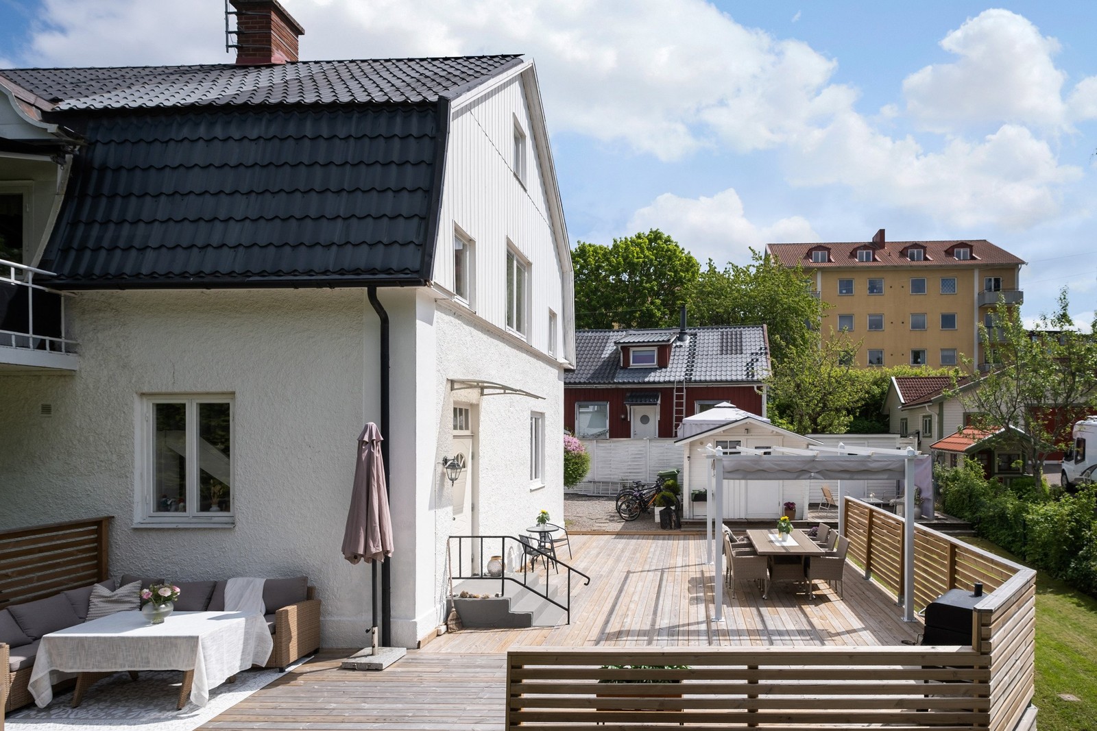 Huset ligger inbäddat i grönska och bjuder på trevliga utemiljöer med lättskött trädgård och stort soldäck, väl avskärmat från insyn trots sitt centrala läge. Den öppna och inbjudande planlösningen skapar en luftig känsla där kök och matsal samspelar på ett harmoniskt sätt på andra våning. På entréplan finns mysigt vardagsrum med kamin för årets kallare dagar. Badrum med stor bastu och totalt fyra sovrum finns till förfogande, samt gott om förvaringsmöjligheter i vindar och förråd.