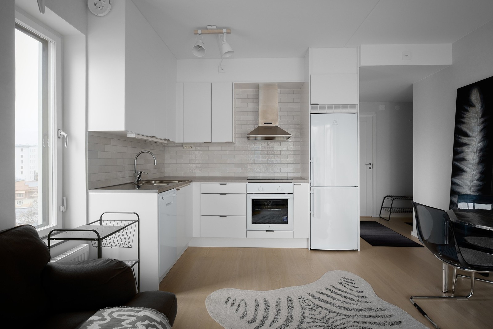 I köksdelen möts du av en modern och stilren inredning med släta luckor, kaklad vägg och integrerade vitvaror. Arbetsytorna är väl tilltagna i förhållande till bostadens storlek och skapar god funktion för både vardag och umgänge.