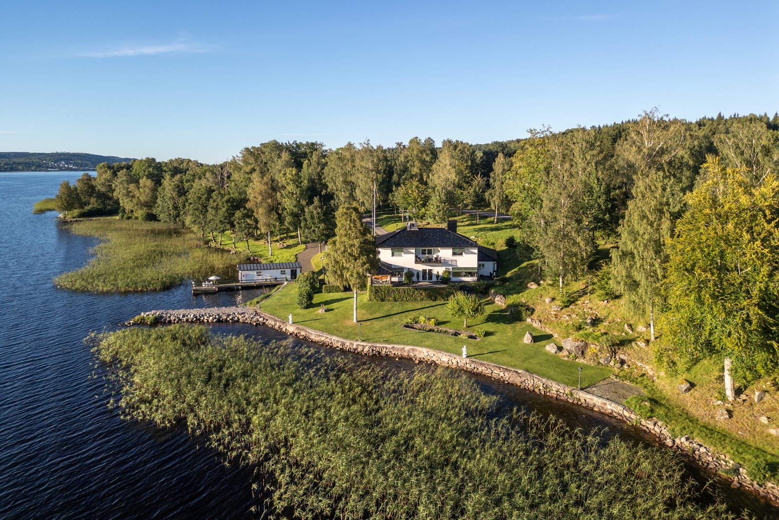 Tidlöst vacker 40-talsvilla på privat strandtomt med brygga, båthus och panoramautsikt över sjön