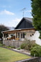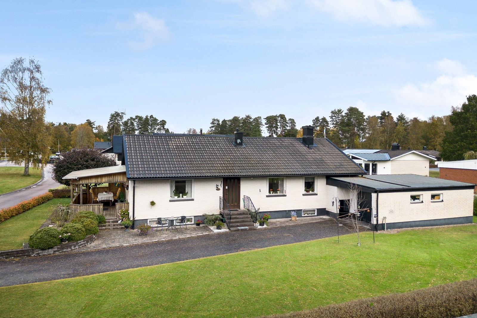 Härlig överbyggd altan samt en stensatt uteplats i anslutning till entrén.