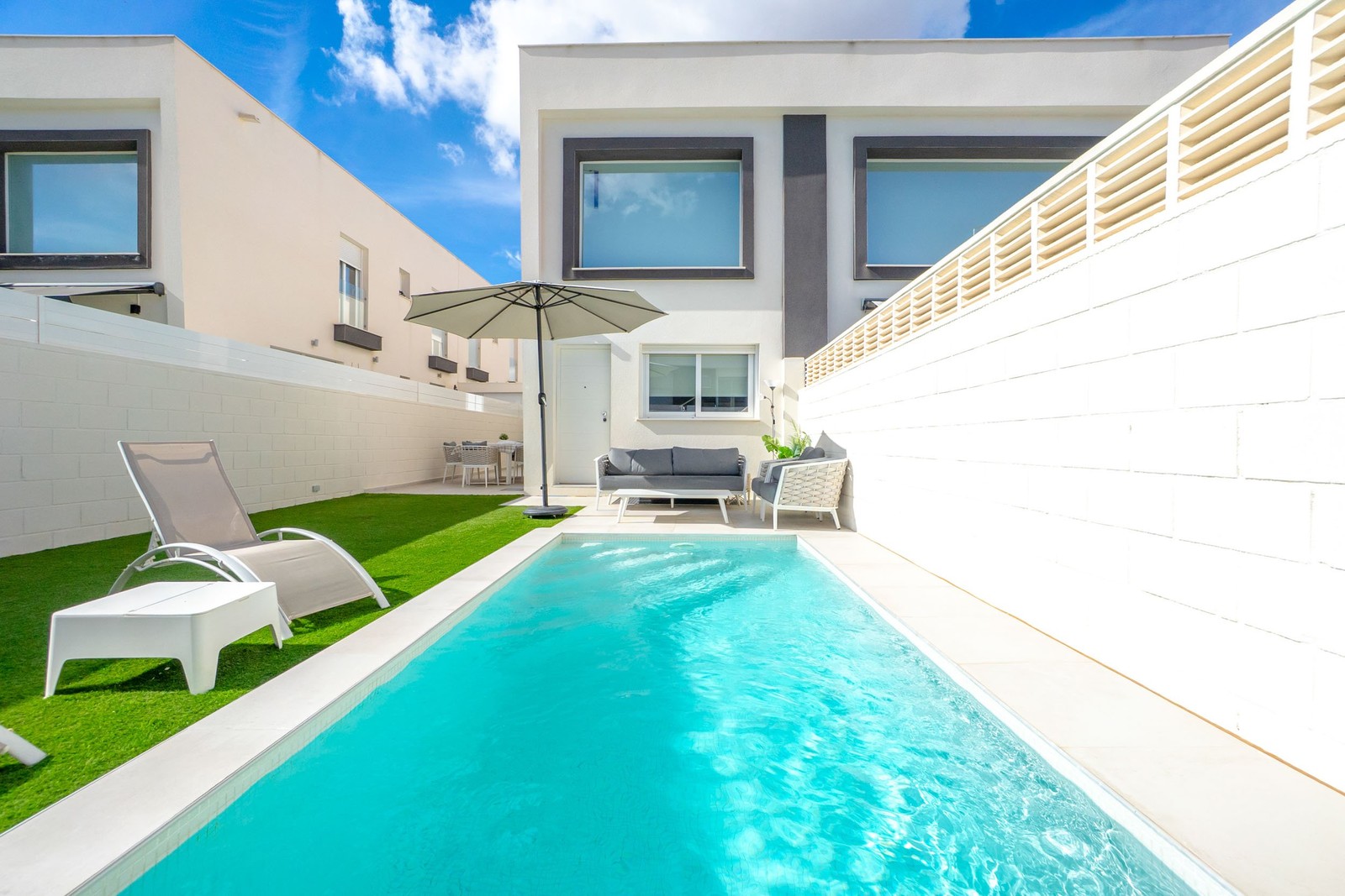 Ljust radhus i tre våningar med privat pool och skandinavisk charm