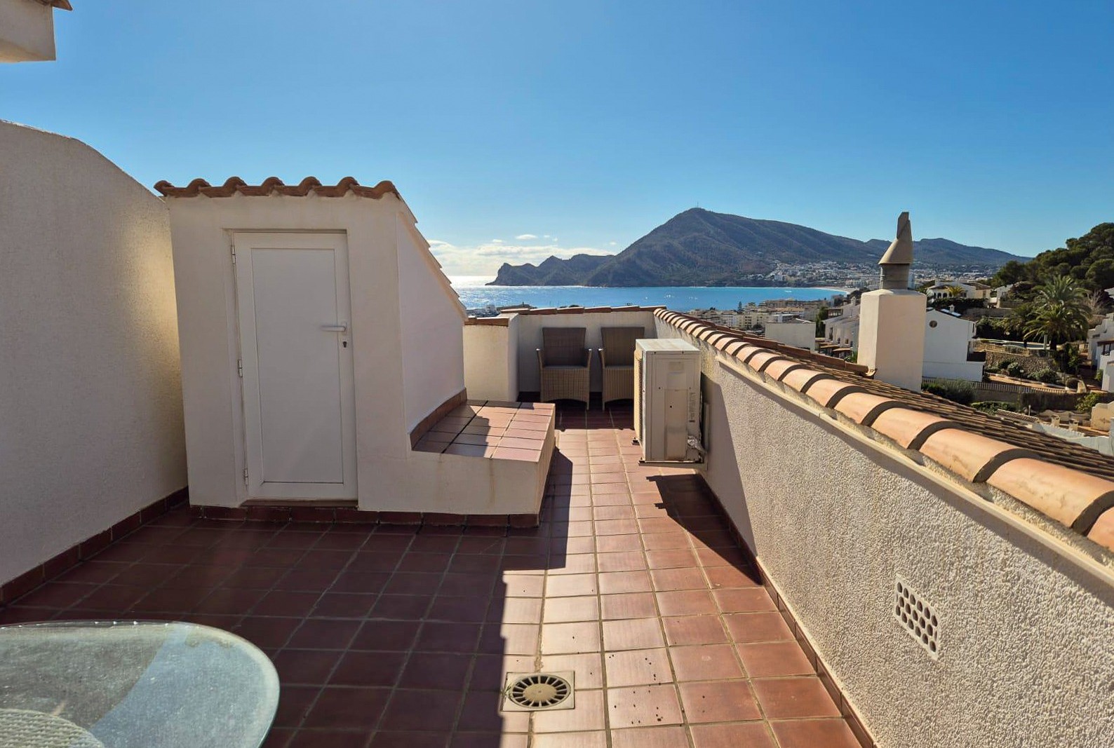 En trappa upp väntar bostadens kronjuvel – en spektakulär takterrass med vidsträckt utsikt över både området och det glittrande Medelhavet.