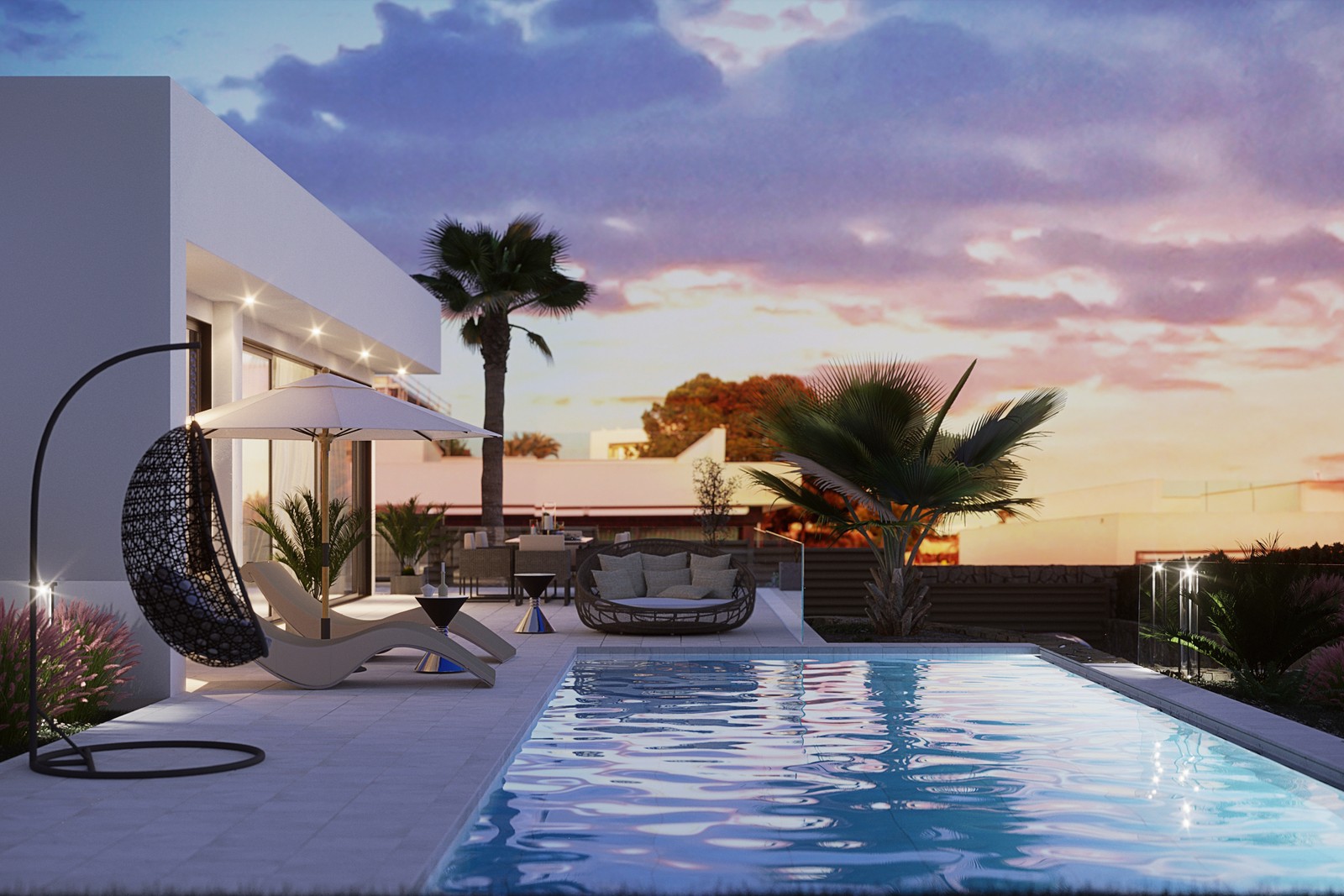 Huset har en öppen planlösning mellan vardagsrummet och köket, tre rymliga sovrum, två badrum, varav ett en-suite med det stora sovrummet och en gästtoalett. Från vardagsrummet och sovrummet har du tillgång till terrassen på framsidan som vetter mot den privata poolen.
