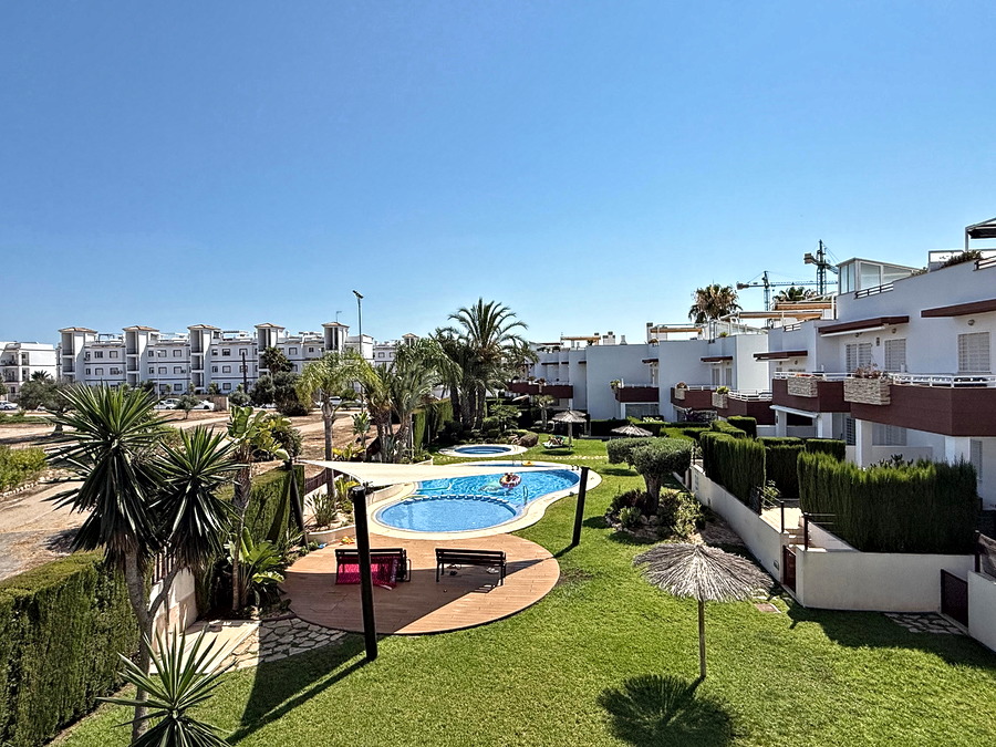 Lägenheten är en del av ett inhägnat bostadsområde med flera pooler, frodiga grönområden och trevliga promenadstråk. I närområdet finns ett brett utbud av restauranger, butiker och stormarknader. En kort promenad tar dig till den vackra stranden La Mata eller det bekväma köpcentret Torremarina. För golfentusiaster och shoppingälskare ligger flera välkända golfbanor och stora köpcentrum, som La Zenia och Habaneras, bara en kort bilresa bort.