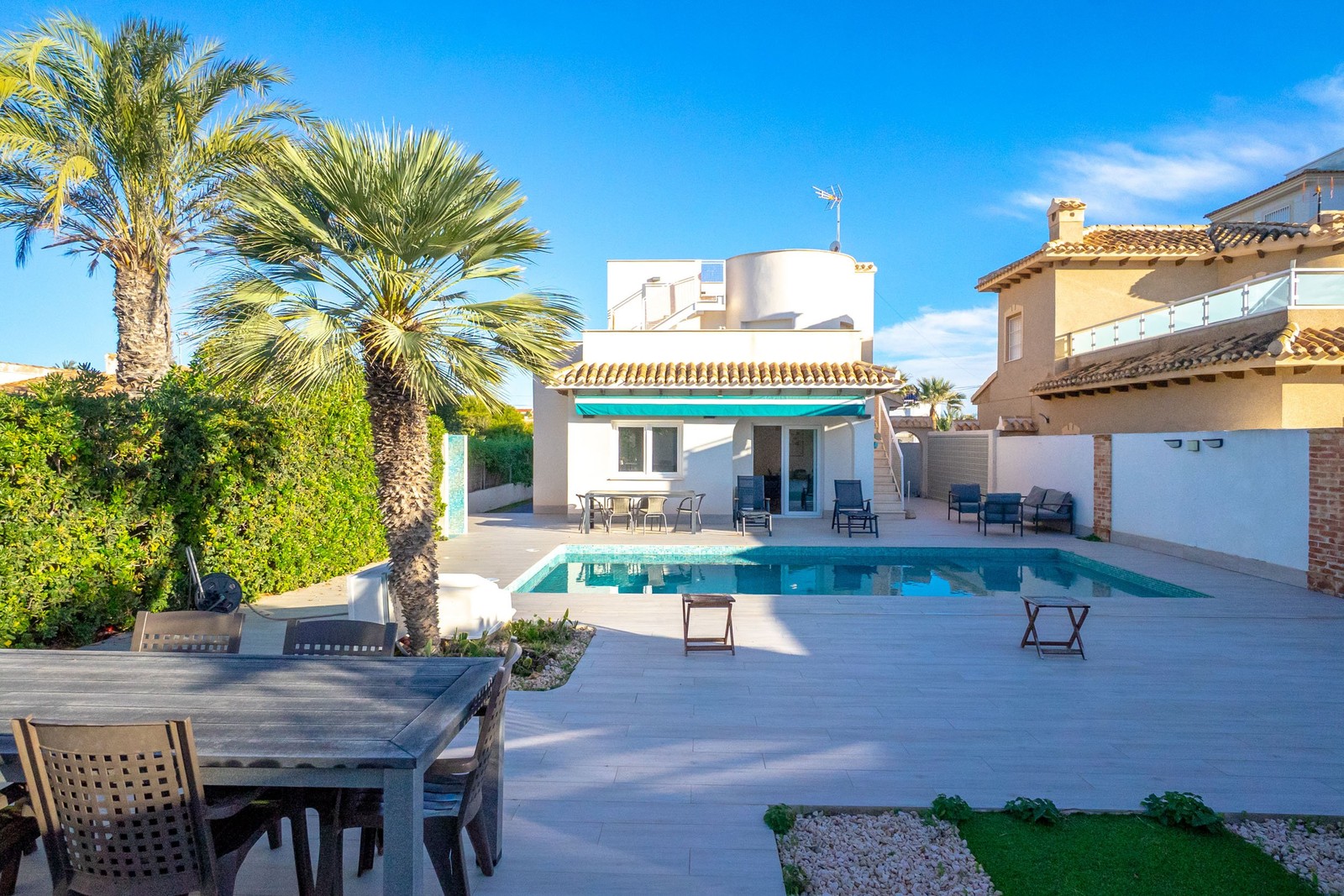 På ett av Playa Flamencas mest eftertraktade lägen ligger denna smakfulla fristående villa som på ett naturligt sätt förenar stil, komfort och hög livskvalitet. Här bor du med stranden som närmsta granne och med bekvämt avstånd till populära shopping- och restaurangområden såsom La Zenia Boulevard. För golfentusiasten finns flera välrenommerade golfbanor inom kort räckhåll.