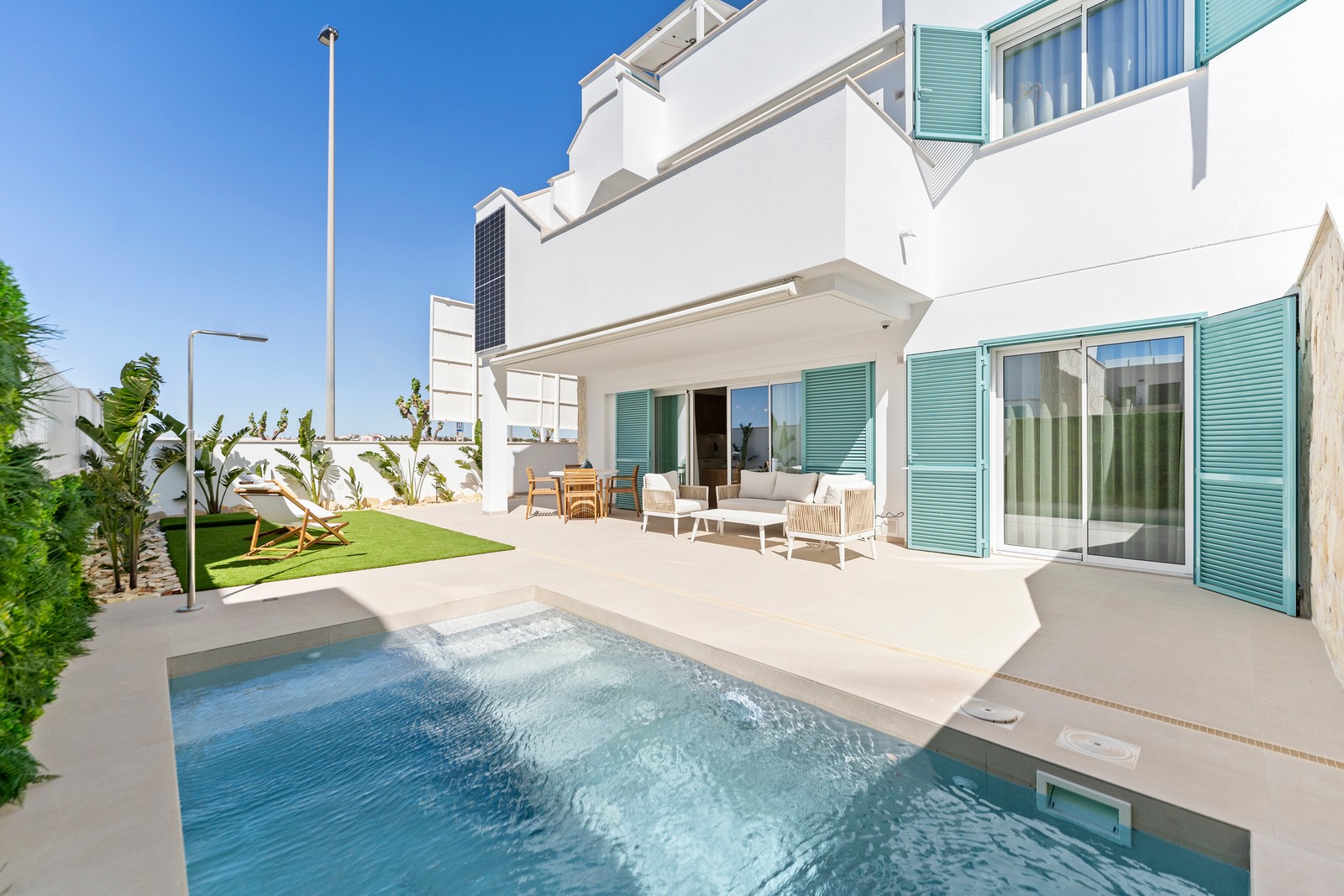 Här finns två terrasser, en på baksidan av bostaden där du har tvättstugan och parkeringsplatsen och en annan, som kan nås från vardagsrummet och huvudsovrummet där du har din privata pool och trädgård.